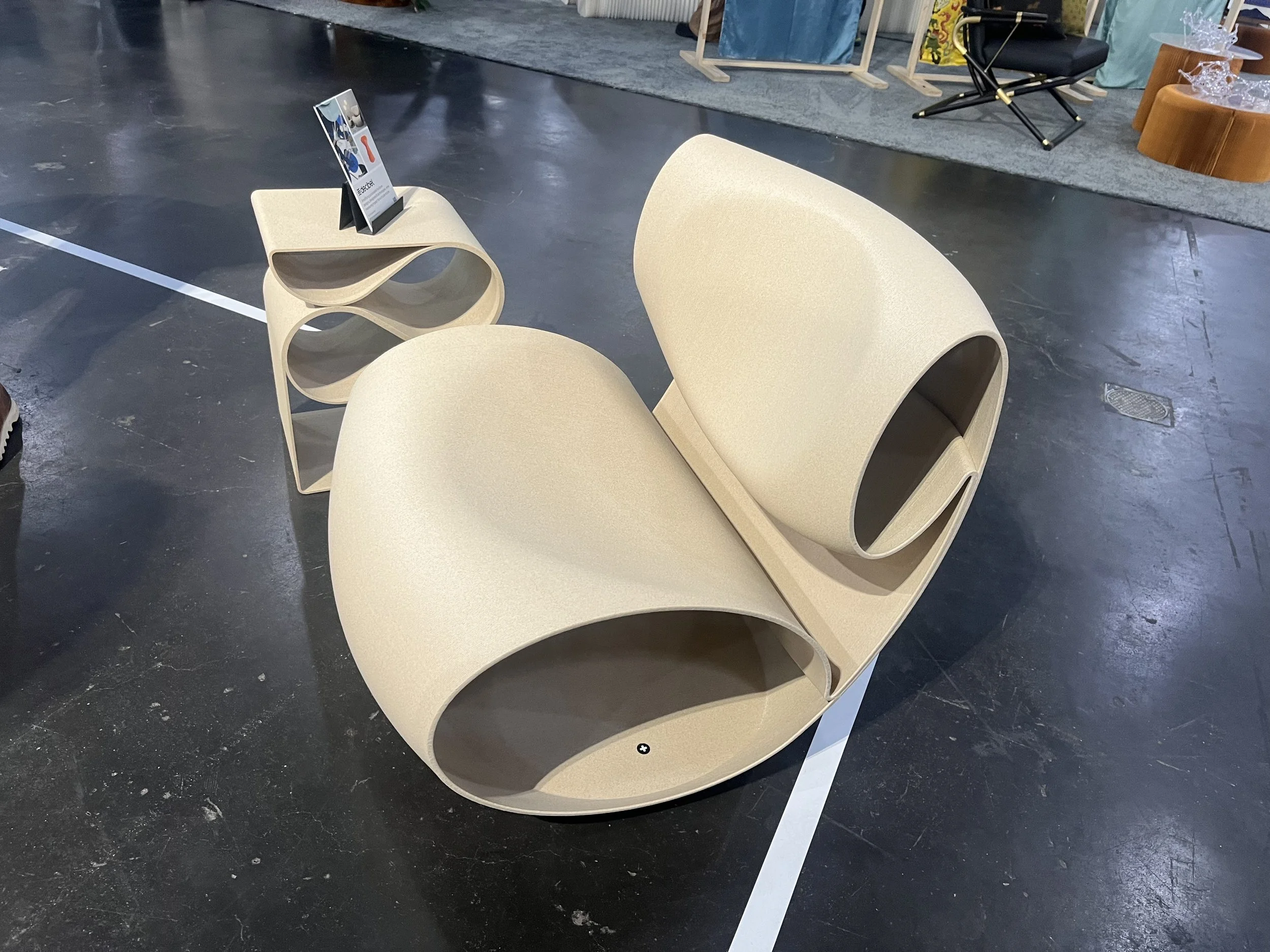 New Jersey-based 3D-printing firm Decibel is partnering with furniture makers from around the world to bring their ideas to life on recycled plastic. At the expo, the company displayed a felt tree from Willo, also based in the Garden State, and a 3D-printed chair and end table (pictured above) from the Germany-based lifestyle brand recozy.